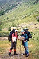 Vers 1700 m, la piste devient sentier quasi horizontal. L'herbe abondante étant très mouillée, et les guêtres étant restées dans les gros sacs à dos, les chaussures, les chaussettes et les pieds sont rapidement trempés. Le brouillard est épais. On ne voit plus rien au-delà de 5 m, même les nombreuses cabanes restent invisibles. Le va-et-vient des troupeaux ayant tracé de nombreuses sentes, il devient nécessaire d'utiliser la boussole et l'altimètre. Ce n'est pas cette fois-ci qu'on prendra du retard pour admirer le massif du Vignemale !