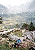 | Descente paisible sur sentier dans un paysage empreint de sérénité. C'est vers la Cabane de Turmo (1750 m) que l'on traverse le rio et que l'on atteint la piste. Ici, lors du passage précédent en 1992, il y avait une multitude de voitures garées. À présent, la piste n'est autorisée qu'au seul véhicule du gardien |