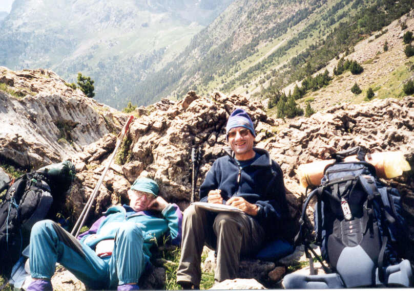 Il reste donc aujourd'hui une longue après-midi de repos devant soi. Yves connaît un chemin, non porté sur les cartes. C'est l'ancien chemin muletier qui grimpe le long de la Pena Blanca en direction du Port de Vénasque. Bien qu'il n'y ait pas de traces tant qu'on reste dans la plaine, on retrouve progressivement celles-ci quand on s'élève vers l'est.