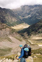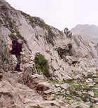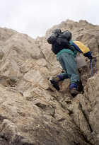 | Le "col" est enfin trouvé. En fait, c'est une simple entaille dans l'arête, et son versant sud est quasiment vertical sur une dizaine de mètres. Cette difficulté se surmonte assez facilement, en technique de désescalade. |