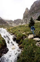 | 7h30. Quand ils quittent leur petit refuge de bon matin, le Plan des Aigualluts est encore désert. Ils sont pleins de courage pour escalader les cimes, mais rechignent à traverser une nouvelle fois la rivière pieds nus. En montant assez haut en amont du Plan, et moyennant quelques acrobaties, ils parviennent à franchir les divers cours d'eau sans quitter leurs chaussures. |