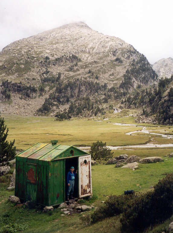 Au-dessus du dernier lac (2360 m), un abri métallique rouge est visible de fort loin. Les trois randonneurs de Majorque y ont passé la nuit, et ils ont dit que c'était bien. Mais Philippe et Yves n'ont pas envie de s'arrêter ici ; ils souhaitent descendre encore beaucoup plus bas, à la sortie sud du tunnel de Viella, pour bénéficier du gîte et du couvert à l'Hospital de Viella. Et ce, d'autant plus que les 3 jeunes gens ont dit que la patronne est une excellente cuisinière.
