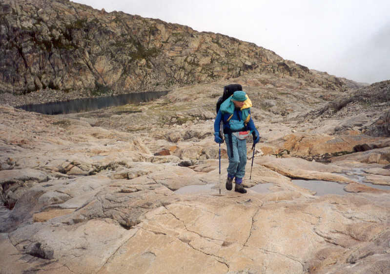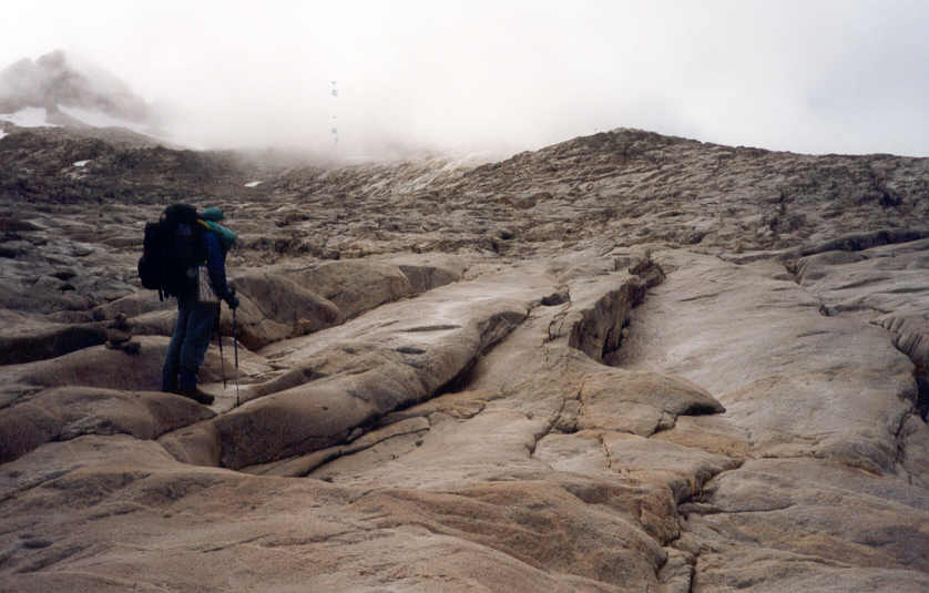 | Les grandes dalles de granit inclinées, polies par les frottements des anciens glaciers, paraissent interminables dans la brume. |