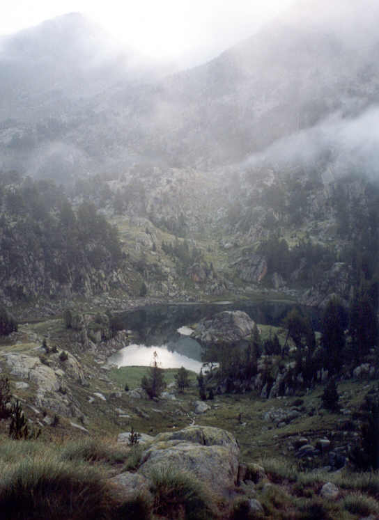 Malgré l'humidité de l'air, n'est-il pas charmant ce petit lac, avec son île rocheuse ? Le soleil qui se devine indique la direction du col qu'il va falloir gravir.