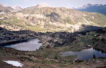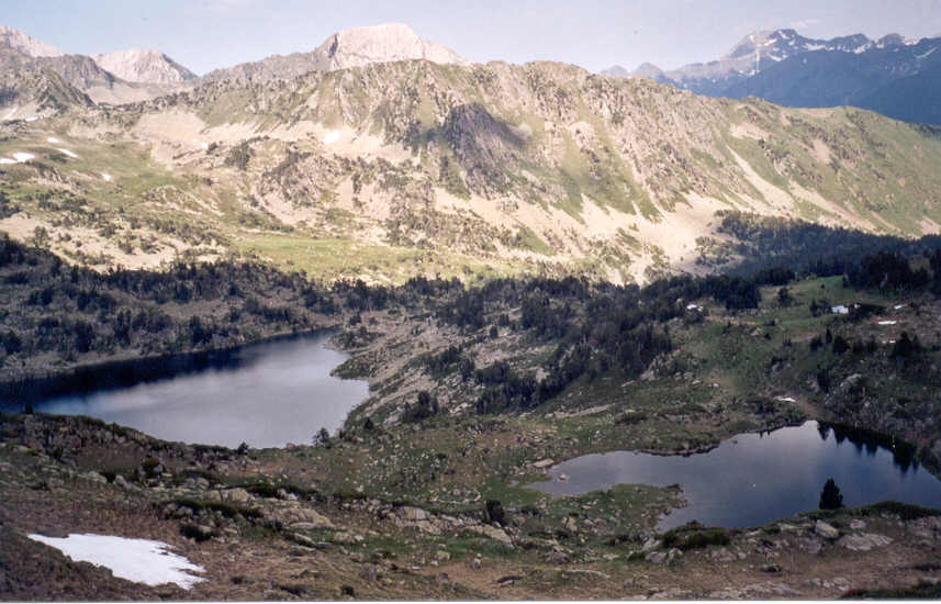 … ils parviennent sur une crête d'où ils dominent deux lacs, les Estanys supérieurs d'Arreu. De là, la vue s'étend sur la suite du parcours. Toujours hors sentier et sans balisage, ils iront demain matin à l'émissaire du grand lac, et ensuite ils franchiront les deux cols qui sont à gauche de la photo.