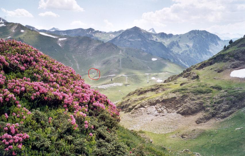 Le Port de la Bonaigua et, à l'intérieur du cercle, le refuge de l'année précédente.