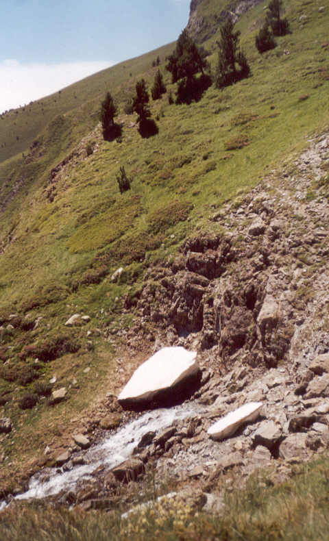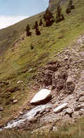 | Le paysage a changé. On retrouve les pâturages dans une cuvette où le torrent se perd sous terre, pour reparaître beaucoup plus bas. C'est là, près de la résurgence, que les deux marcheurs décident de faire leur pause repas. |