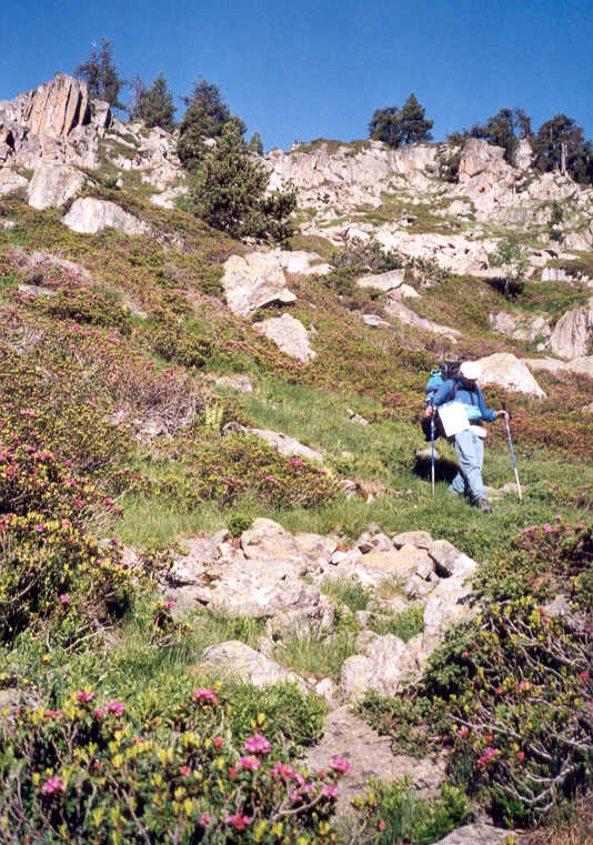 Des lacs supérieurs d'Arreu jusqu'au refuge Gracia Airoto, le parcours se déroule sans repère humain. Ni sentier, ni marque de peinture, ni cairn. La progression est plutôt difficile, car elle est entravée par les nombreux massifs de rhododendrons qu'il faut souvent se résoudre à traverser. A posteriori, quand on se souvient du brouillard qu'il y avait l'année dernière au Port de la Bonaigua, s'envolent les regrets de ne pas avoir continué…