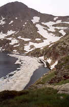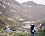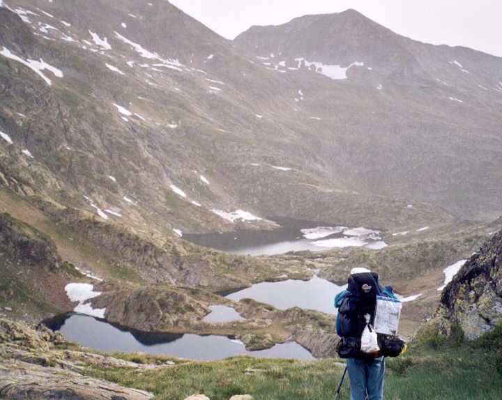 | Au-delà du dernier lac, l'Estany de la Gallina, on distingue l'abri Enric Pujol, juché sur un promontoire, et but normal de l'étape d'hier. |