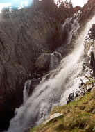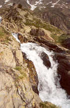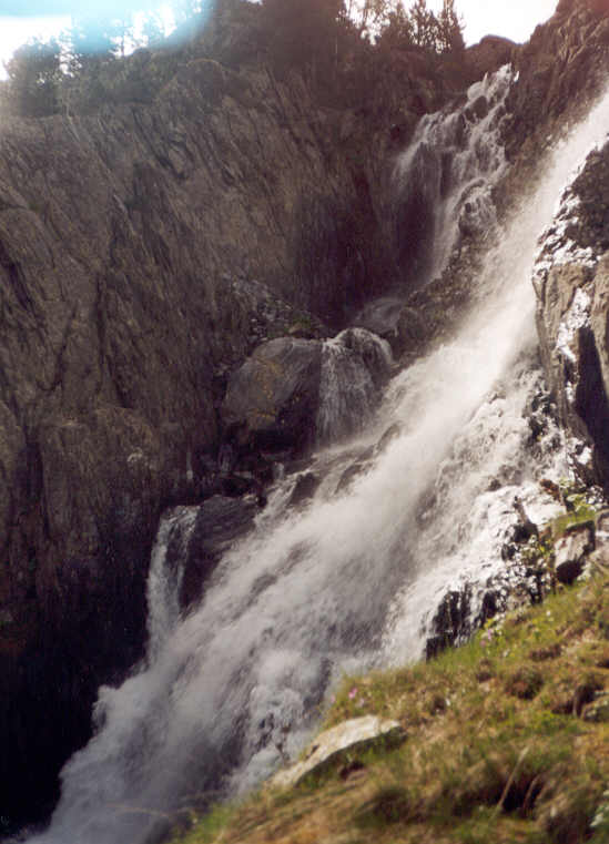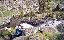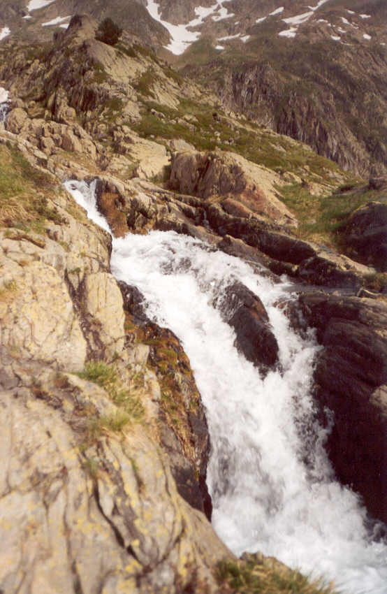 | À noter le passage à gué du torrent, au-dessus d'une cascade. C'est ici, et on le devine sur la photo, que débute un balisage à la peinture verte, avec l'indication "Refuge" ou "Certascan", ou les deux ? ( trou de mémoire de l'auteur !). |