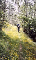 Après avoir suivi une piste pendant 500 mètres, l'itinéraire se continue par un sentier quasi horizontal, qui traverse une forêt de bouleaux. Le soleil étant revenu, avec les jeux de lumière et les tapis de fleurs jaunes au sol, l'endroit possède un charme fou. |
