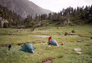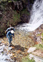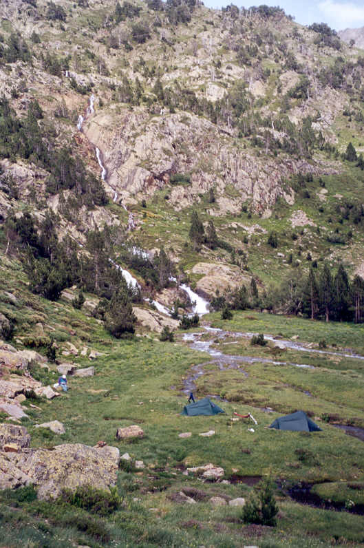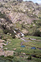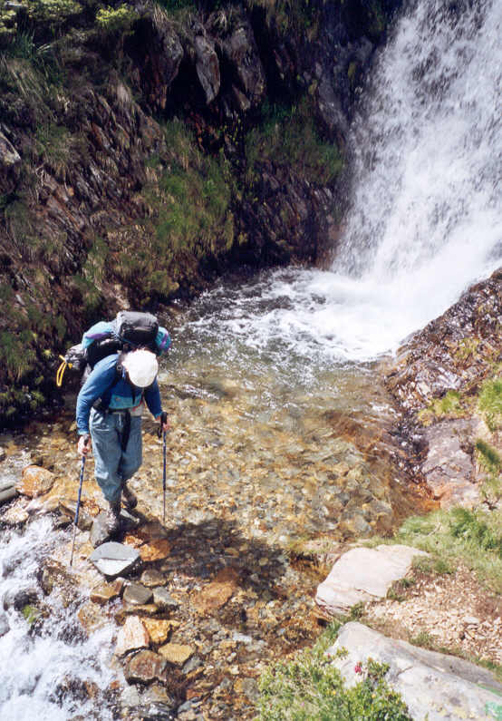 Un peu plus haut, on débouche dans une cuvette marécageuse (altitude 2050 m), où se déversent de puissantes cascades. Les torrents se divisent en nombreux bras sinueux. Voilà un espace plat où il sera possible de planter les tentes, pour autant que l'on arrive à trouver quelques mètres carrés de sol sec. |