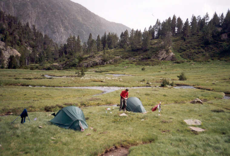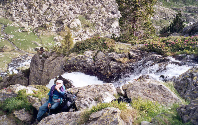 | C'est ainsi que, en voulant couper au plus court vers le lac inférieur, l'Estany de Llavera, Yves et Philippe se retrouvent bloqués devant un torrent puissant qui a creusé un mini-canyon. Séparément, chacun cherche un passage. En prenant des risques, car toute erreur d'appréciation aurait été grave, Yves traverse le premier. Puis il remonte vers Philippe, et l'aide à passer, en lui tendant un bâton. |