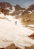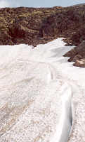 De l'autre côté, il y a un grand névé dont la pente est impressionnante. Les deux "artistes" réussissent à le descendre sans encombre, en prenant soin toutefois de passer par les deux îlots rocheux très caractéristiques, et en rejoignant aussi tôt que possible la rive gauche du névé. |