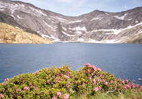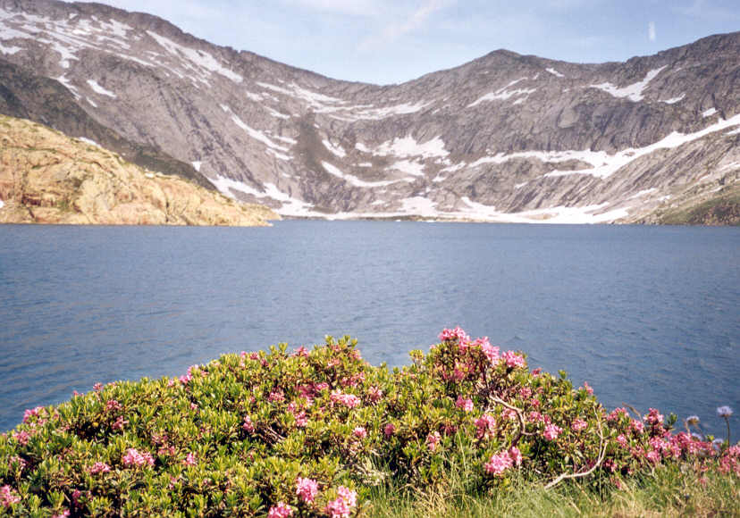 | Le lac est immense. Entouré du rose des rhododendrons et du blanc des neiges de printemps, cette petite mer intérieure a le bleu de la Méditerranée. |