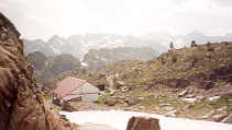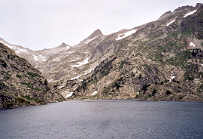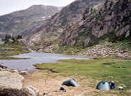 | La suite consiste à passer de l'autre côté du barrage, suivre la rive opposée jusqu'au torrent qui alimente le lac par le nord. Il faut alors remonter ce ruisseau et franchir un défilé. On débouche dans un vallon et un petit laquet (2025m) "non figuré sur les cartes". C'est l'emplacement de bivouac indiqué par le gardien du refuge. |