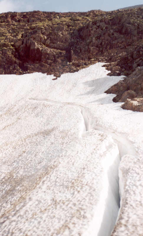 Durant l'hiver, la neige s'est tellement accumulée ici qu'il y a une crevasse sur un névé, chose jamais vue auparavant. |