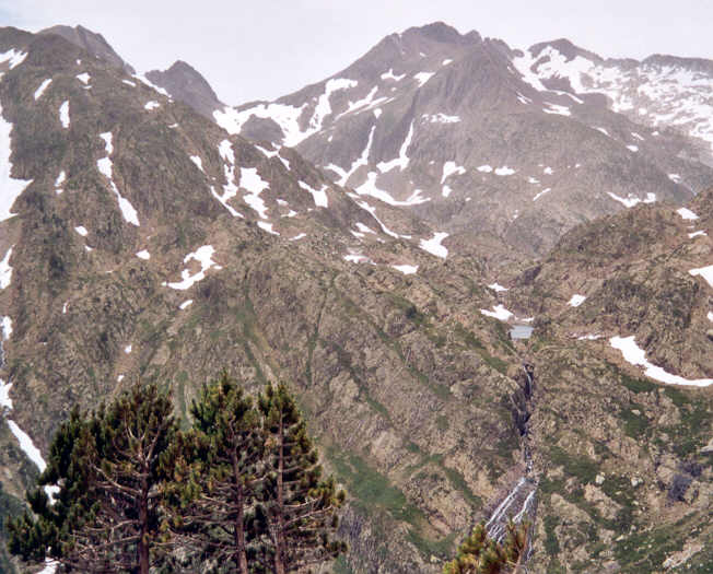 Le sentier - car il y a un sentier - remonte le cours du torrent Riu dels Guerosos. Et le soleil revient alors qu'apparaissent les premiers névés aux Estanys de Gueroso.