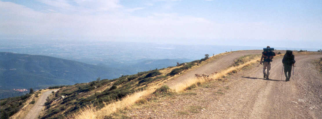 À droite, le Vallespir, haute vallée du Tech. À gauche, l'immense plaine du Roussillon, et la Mer Méditerranée qui aujourd'hui est bien visible (hier, du sommet du Canigou, elle était cachée par une brume de chaleur).