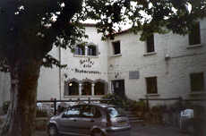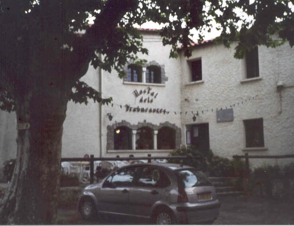 | 15 h. Arrivée devant le nouveau gîte, l'Hostal dels Trabucayres, ce qui signifie "les bandits de grand chemin", ou "brigands". Monique est là, surprise de les voir arriver si tôt, et fortement impressionnée par la conduite sur les routes étroites et sinueuses de montagne.