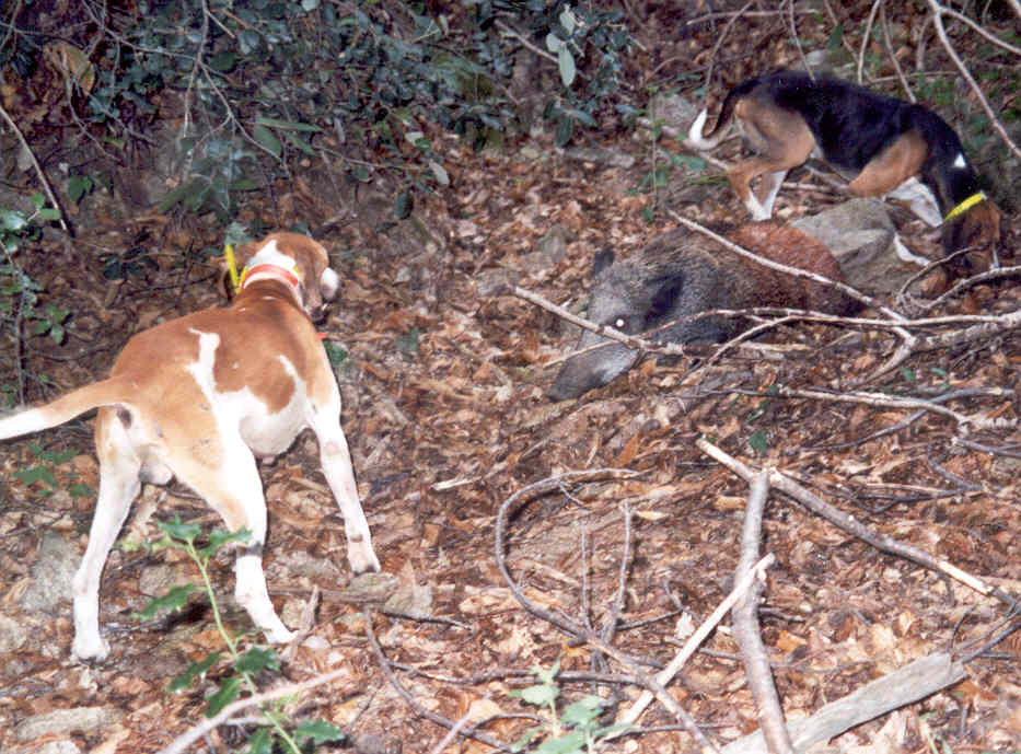 | Quelques minutes plus tard, ils tombent en arrêt devant un sanglier agonisant, surveillé de près par deux chiens. Plus haut, les deux marcheurs indiquent l'emplacement du gibier à un chasseur. Fin de l'épisode quand ils entendent la détonation sèche du coup de grâce.